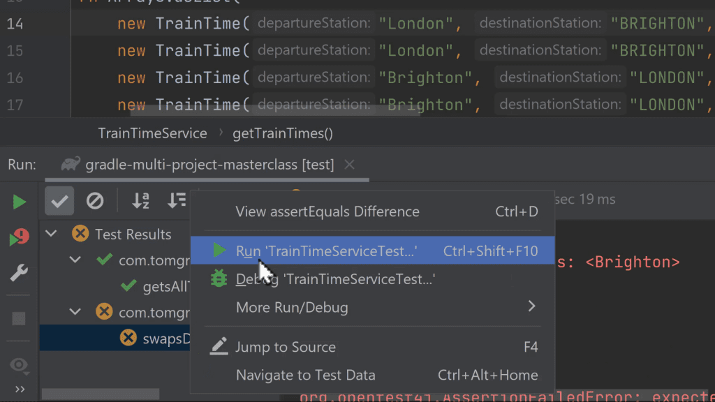 Once you've applied any fixes, you can run all the tests again with Shift+F10 (Windows) or ⌃ R (Mac). Or right click a failing test and select run to only run that specific test.