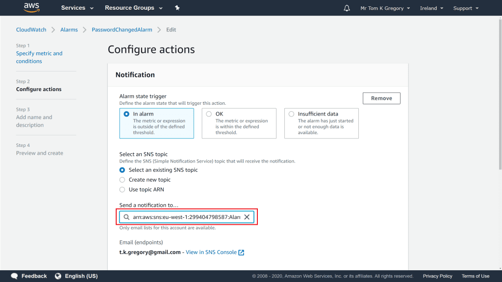The last thing to do here is create an action in the alarm so that it sends a notification to SNS whenever it enters the ALARM status.