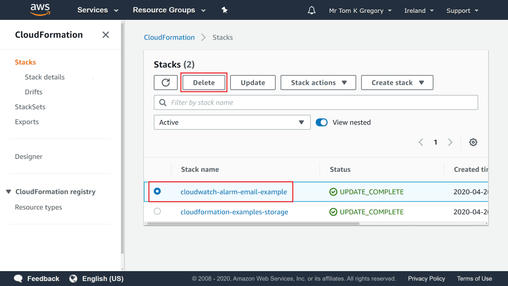 Go to Services > CloudFormation. Select the cloudwatch-alarm-email-example stack, then click Delete. On the confirmation dialog, select Delete stack: