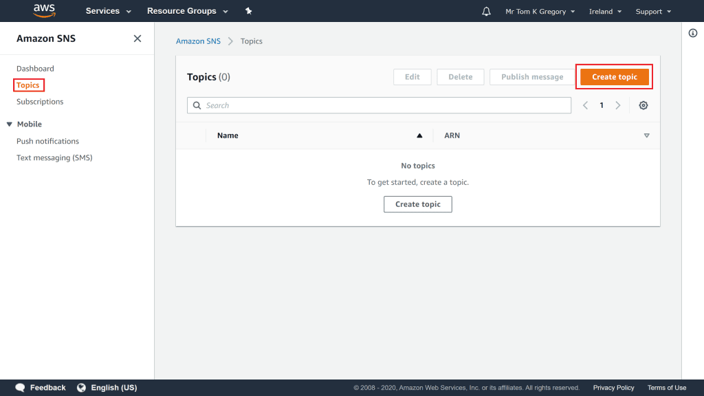 Select Topics from the left hand navigation. This page is where any existing topics are shown. Let's create a new one, so select Create topic: