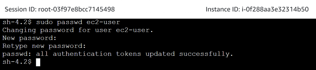 In the terminal window that appears, we'll run sudo passwd ec2-user. You'll then need to enter the password twice. To generate a random password try this site: