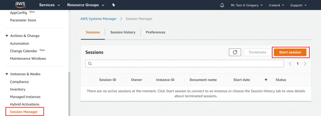 Then in the left hand navigation select Session Manager, then click the orange Start session button: