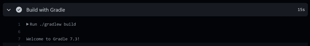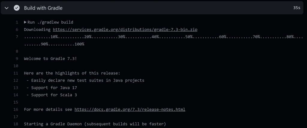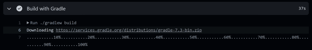 For example, if we look into the Build with Gradle step for our latest workflow run, we'll see Gradle downloading the wrapper again.