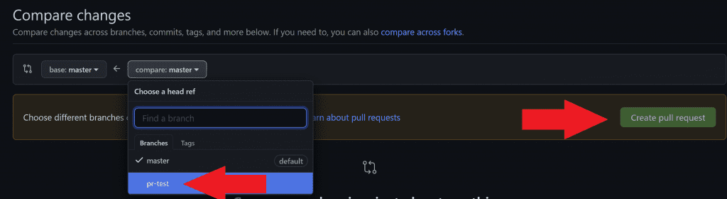 Now let's create a new PR to test the pull_request event. Under Pull requests select New pull request. Choose the pr-test branch, then select Create pull request.
