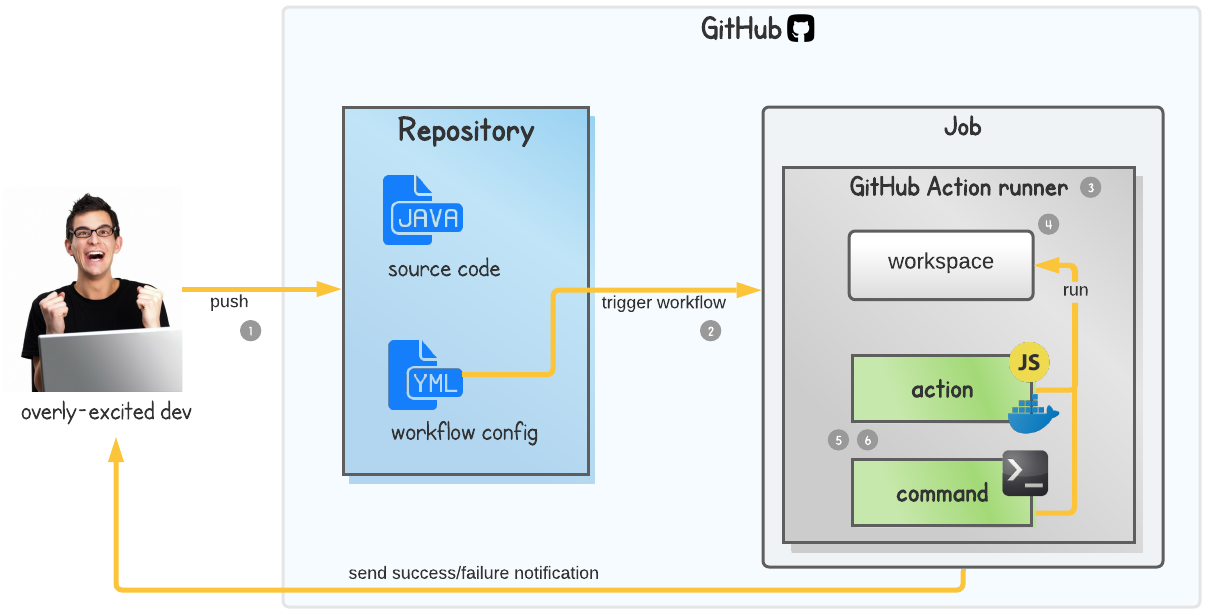 Imagine a scenario where your enthusiastic colleague pushes code changes to your Gradle project repository hosted on GitHub. We'll explore step-by-step what happens to achieve the goal of building the project, resulting in either success or failure. As we go, you'll learn the relevant GitHub specific terminology.