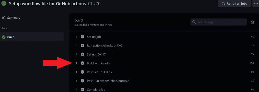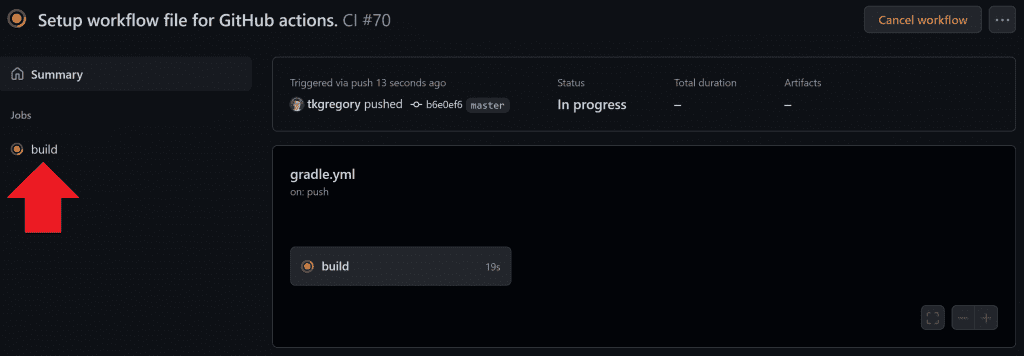 actions/checkoutaction puts the source code in the workspace, then the./gradlew buildcommand builds the application. -