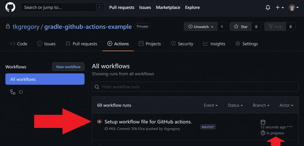 Log into GitHub, navigate to your repository, then click the Actions tab. You'll see your new workflow, with a queued or in progress workflow run.
