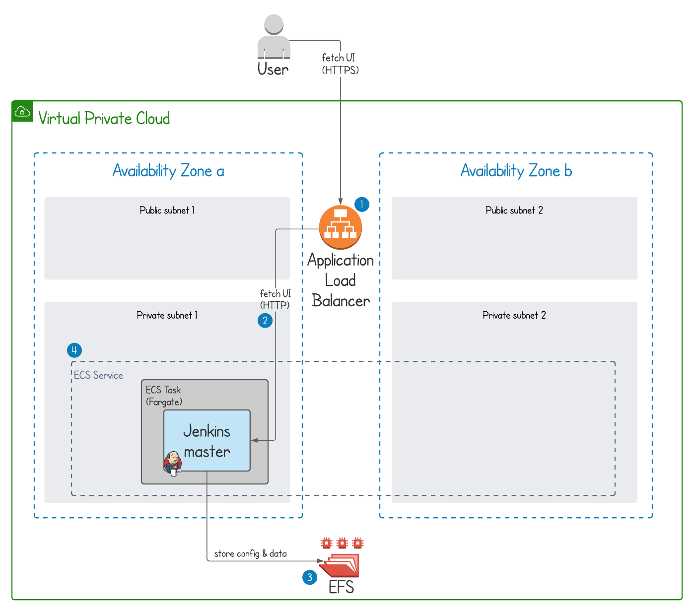 Integration with Application Load Balancer (ALB) – the only access point into Jenkins should be via an ALB which serves the Jenkins UI over HTTPS on port 443. An SSL certificate will be provided to the ALB for the domain we want Jenkins to be available on. Registration of ECS tasks into the ALB is handled automatically by ECS.