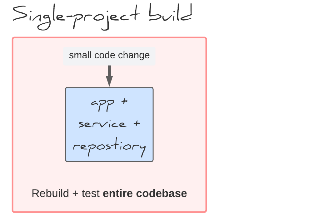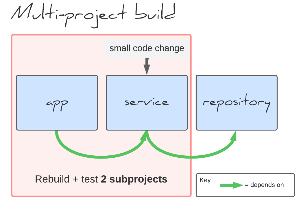 In a multi-project build a small code change only requires building the changed subproject and any dependent projects. For example, changing service requires rebuilding app and service, but not repository.