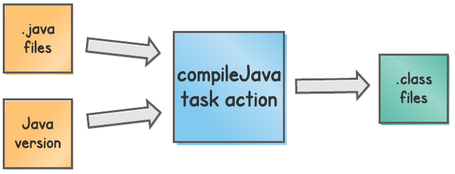 compileJava taskThe relationship between task inputs and outputs is normally that a change in the inputs creates a change in the outputs. In the case of compileJava, if we change the .java files, it makes sense that the compiled .class files would also change.