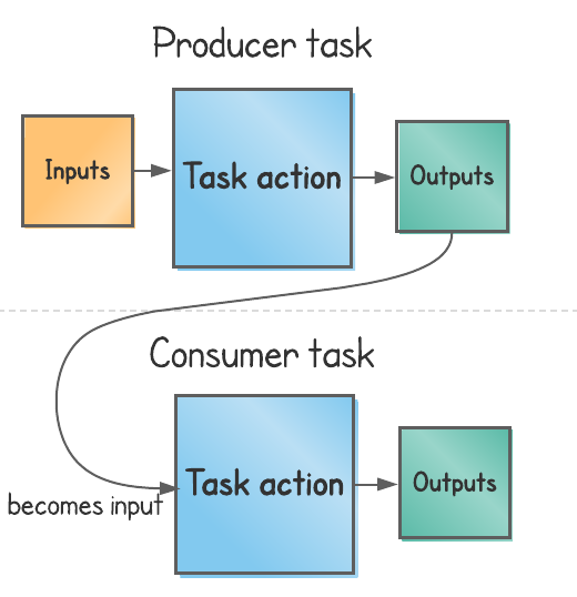 - When the outputs of the producer task change, the consumer task gets executed again since it's no longer up-to-date.