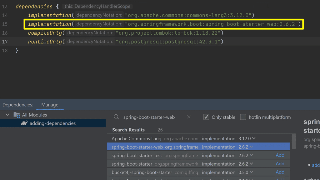 You can then easily search for and add any dependency, all without leaving the IDE!