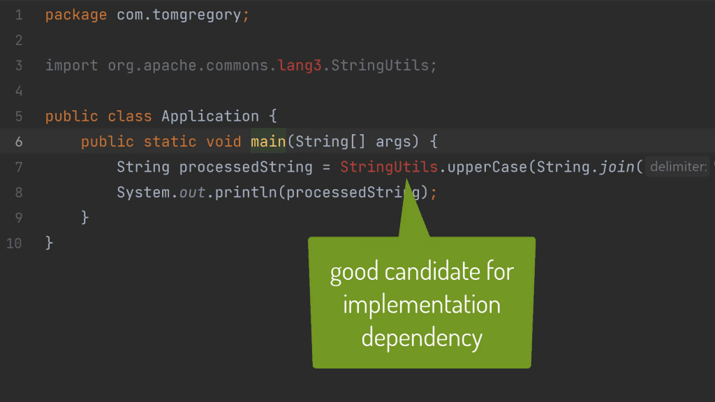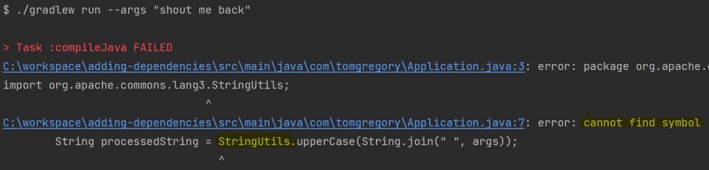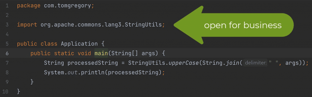 Sometimes when you're developing an application you need to use code from another library. In the below Java application built with Gradle, I want to use the StringUtils class to process the input by switching it to upper case.