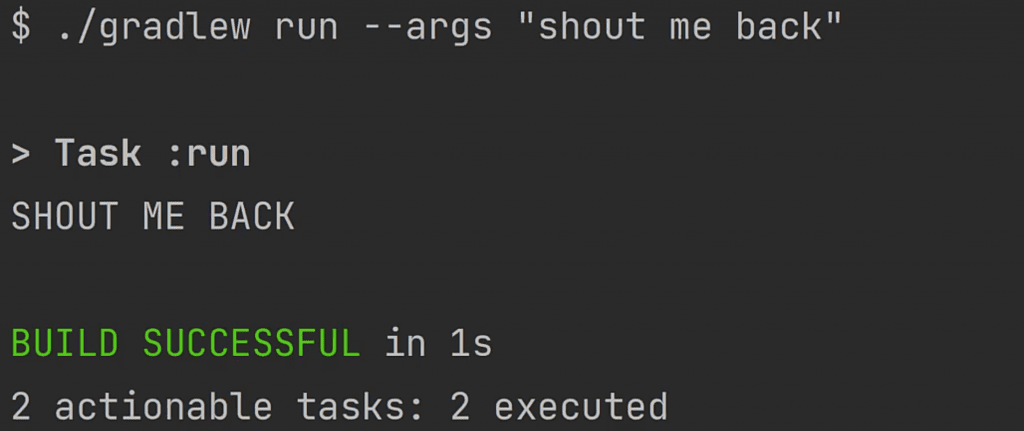 1 actionable task: 1 executedIt shows that indeed our compile and runtime classpaths now contain commons-lang3. That means Gradle is able to compile and run our code correctly. Nice!