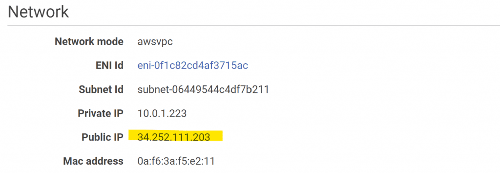 Clicking on a task id shows its details, including public IP address.