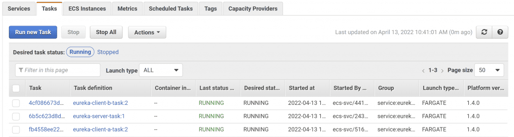 Assuming it's successfully applied (what could go wrong?), we can see the 3 ECS tasks within the AWS console.