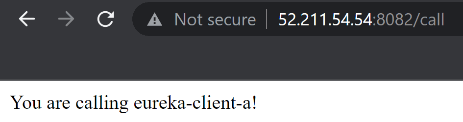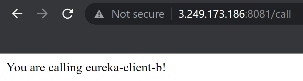 Let's access eureka-client-a at http://<private-ip>:8081/call. It returns the string from eureka-client-b, so everything's working!