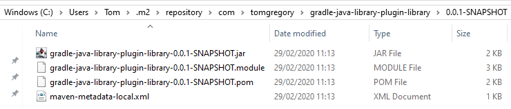 5 actionable tasks: 5 executedNavigating to my ~/.m2/repository/com/tomgregory directory I can see we've now got a gradle-java-library-plugin-library directory. Within that we have another directory for our 0.0.1-SNAPSHOT version: