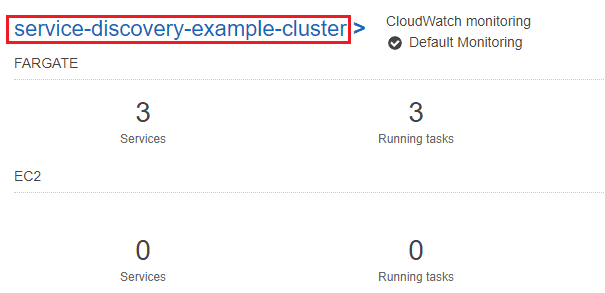 Now we can observe the service discovery in action! Navigate to Services > Elastic Container Service and click on the service-discovery-example-cluster cluster name: