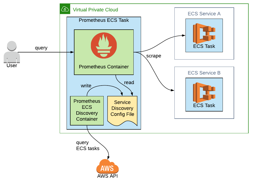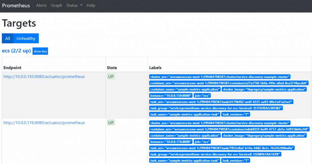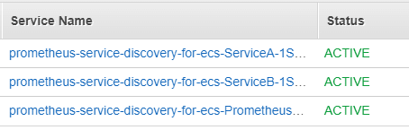 The other downside is that you still have to configure Prometheus with a domain name for each ECS service that you want it to scrape. The approach using the AWS API doesn't have this problem, as any new ECS tasks are discovered automatically as long at they have the correct Docker labels.