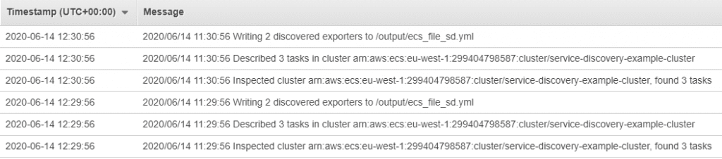 If you needed any more proof to know that service discovery is working properly, we can take a quick look at the logs for prometheus-ecs-discovery.