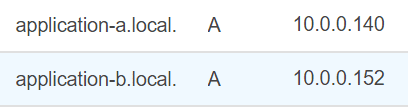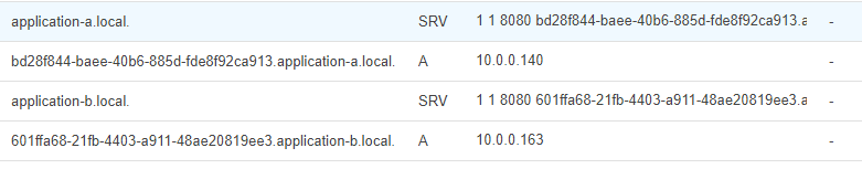 This allows you to register an A record in a private DNS namespace, mapping a domain name such as application-a to one or more private IP addresses. Here's how the A records for the our two ECS services might look:
