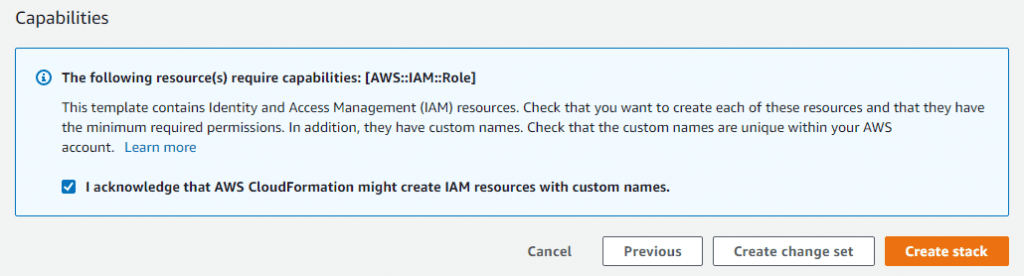 Once you click the Launch Stack button, just click Next three times, accepting all the defaults. On the Review page select the checkbox to say that the stack can create IAM resources, then click Create stack.