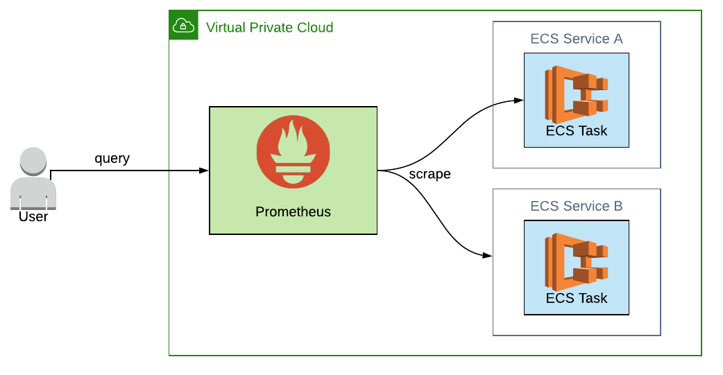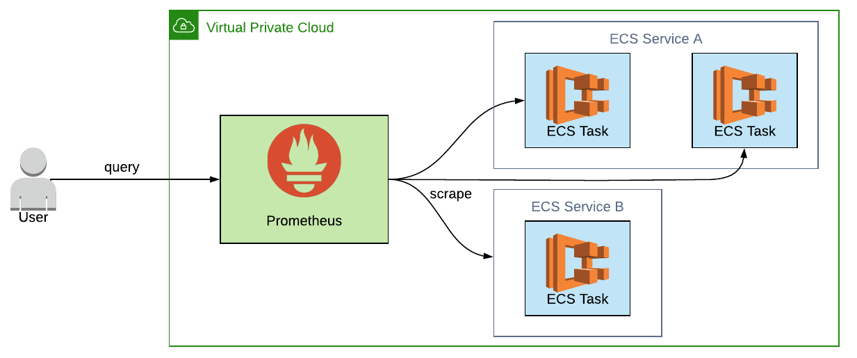 we can't configure Prometheus with the individual private IP addresses of the ECS tasks as these change dynamically as tasks are added or removed, so the Prometheus configuration would become quickly out of date