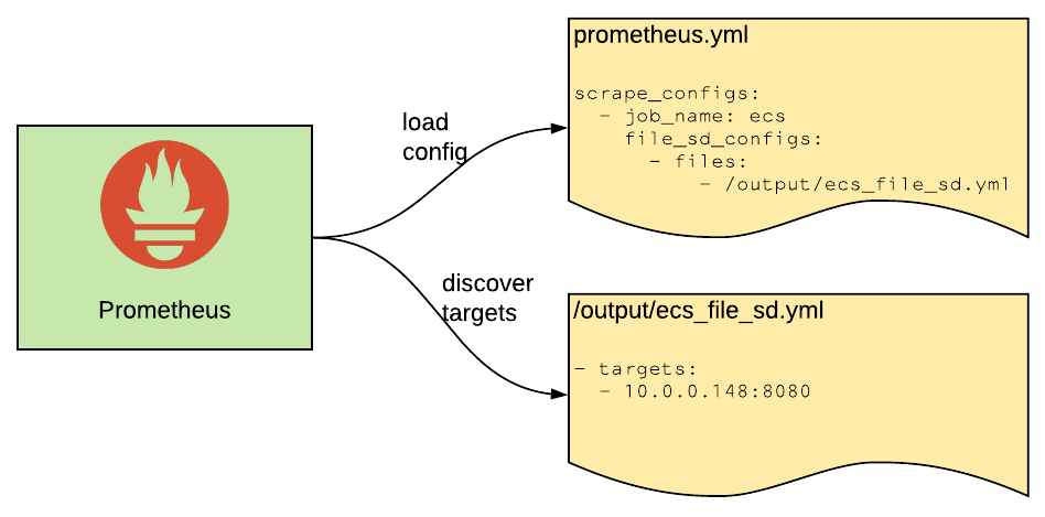 Bringing these ideas together, we're going to need a way to run both the Prometheus and prometheus-ecs-discovery containers side-by-side with access to the same file where the list of targets will be written and read.