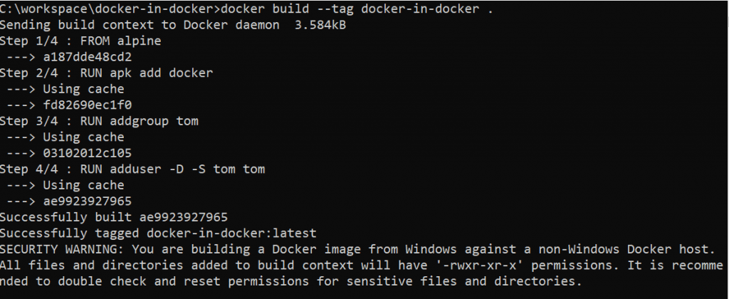 Let's build the image with docker build --tag docker-in-docker-non-root ., similar to the previous example.