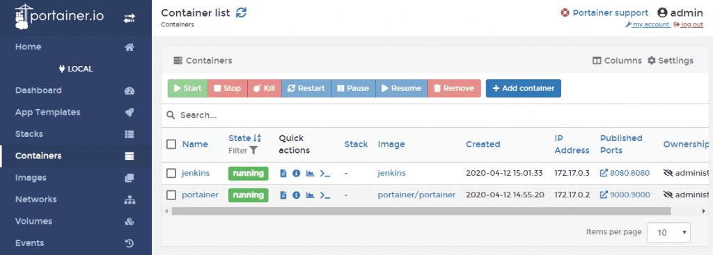 With this configuration, Portainer then has access to the Windows Docker daemon, and can issue whatever commands it needs to. For example, below we can see a list of the running containers:
