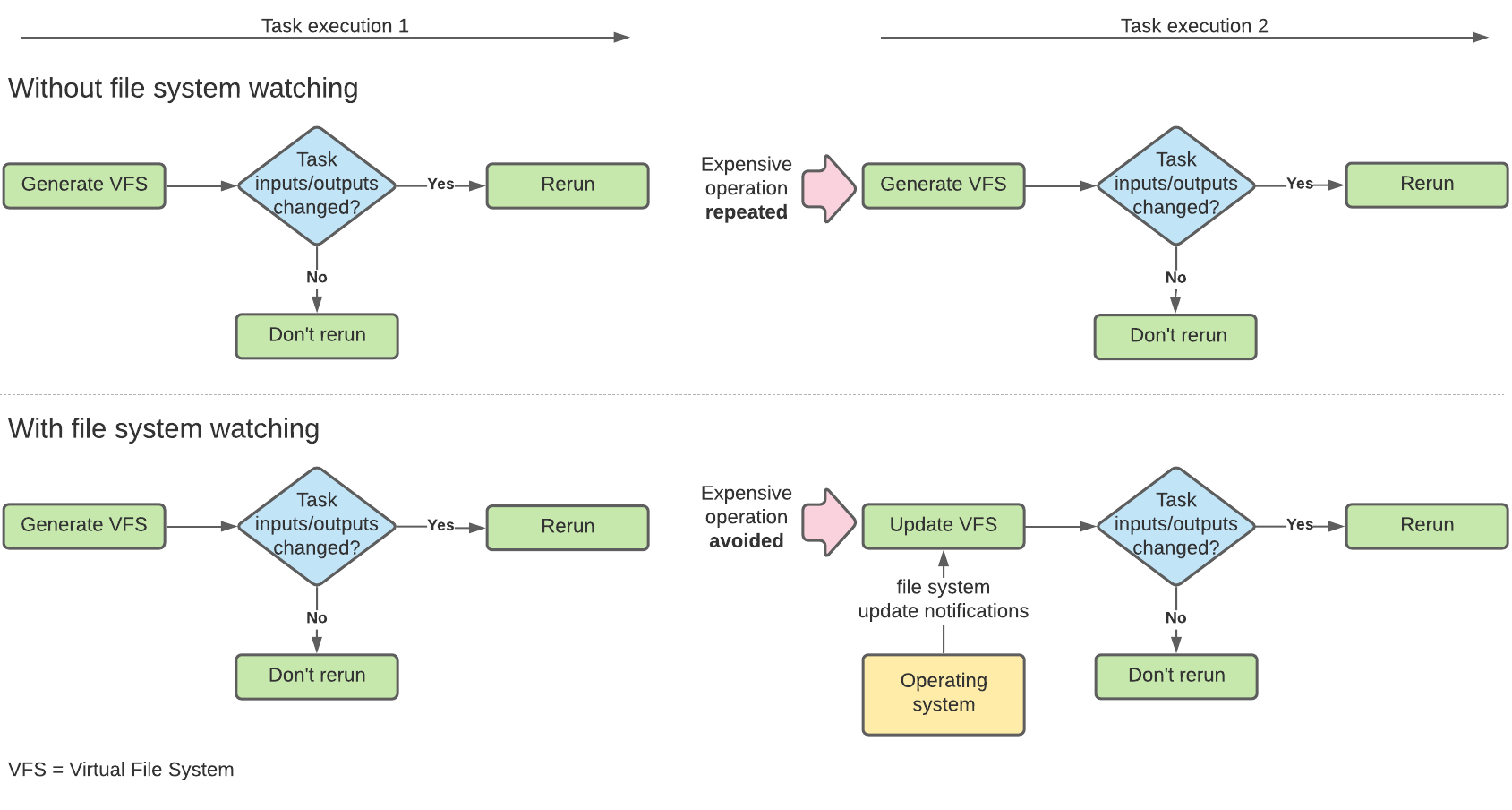 This constant reloading of the filesystem into what Gradle calls the Virtual File System (VFS) is an expensive process, since the VFS must be loaded for every build. File system watching allows this information to be kept in memory within the Gradle daemon, and updated automatically through notifications of file system updates from the operating system.